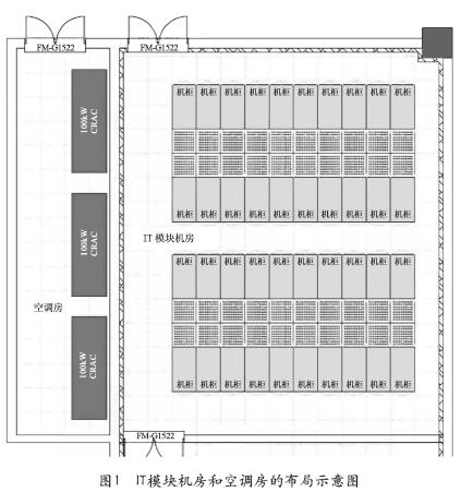 我们以一个简单的模块机房为例,来说明设计时对气流管理的要点。某模块机房和精密空调房的建筑面积为104平方米,共有40个IT机柜,每个机柜的平均发热为3.8kW,40个机柜平均分成四排组成两个冷通道封闭模块,采用防静电地板构成的静压箱下送风方式。图1为IT模化机房和空调房的布局示意图。