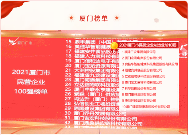 近日,厦门市工商联(总商会)首次发布“2021厦门市民营企业100强”,科华数据位居34。在“2021厦门市民营企业制造业20强”及“2021厦门市民营企业科技创新20强”中分别位列第7及第8。